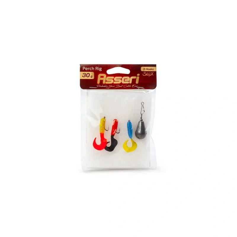 Valmis ahvenapüügi rakendus Asseri brändilt 3 konksu ja alumise raskusega. Ühele tamiilile on juba kokku pandud kolm külgharuga rakendust jigikonksude ja kummikaladega ning all on tilgakujuline raskus — kiire kasutada: seo põhiliinile ja hakka püüdma. Sobib aktiivseks ahvena otsinguks (astmeline vedu, tõsted, lohistamine) ning soovi korral saab peibutised lihtsalt enda omade vastu vahetada.