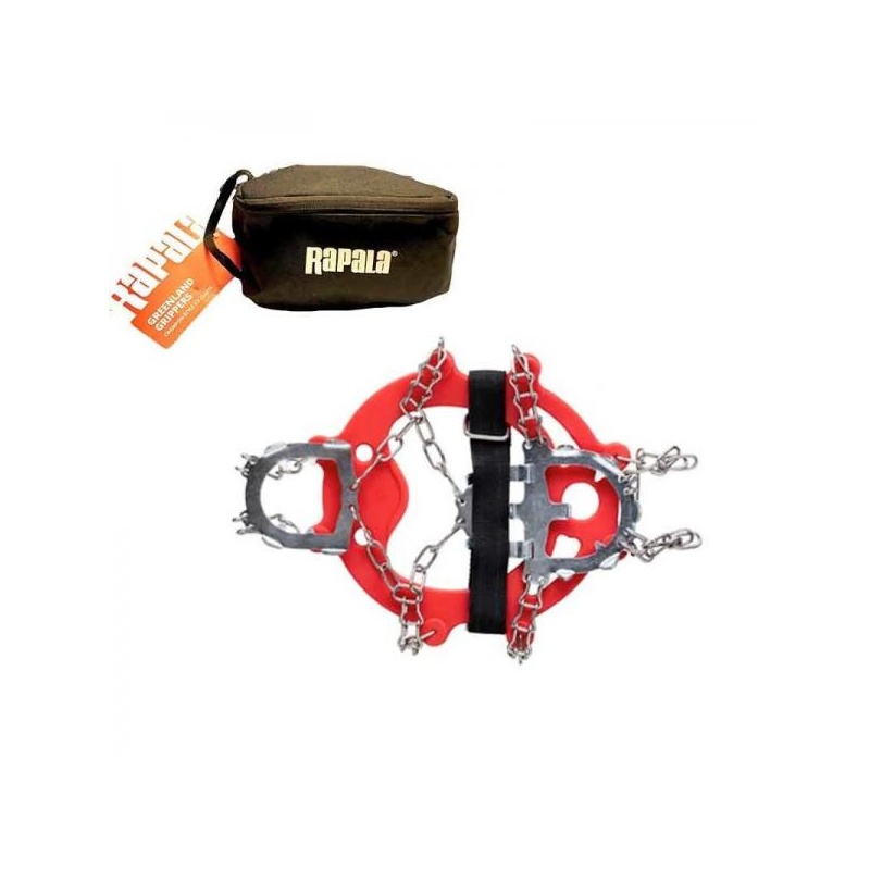 Rapala Greenland Ice Grippers. Powerful and sturdy spikes for perfect grip on the ice or other slippery surfaces! Durable rubber. Velcro closure above the foot for optimal fit around the shoe. Easy to put on and off. Storage bag included.