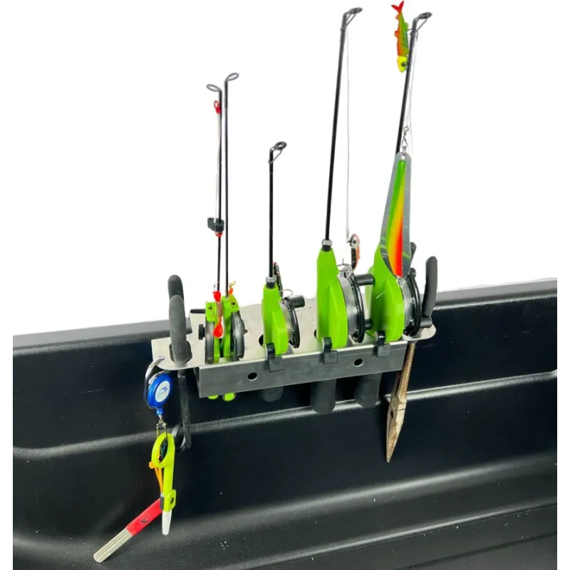 Jasu Mini Rod Holder is tiny but very handy. It has places for 4 rods and 2 slim models fit in one hole. There are bigger holes for tools in both ends and 2 tiny holes where you can attach other accessories e.g. with a yoyo. This holder is perfect for Jasu Kide Sleds, but also for other sleds with a max 4cm thick edge, as well as kicksleds. It can be attached to the boat with railgrips. There are also screw holes so you can attached it on the wall with screws. Without screws, this holder can be attached to any edges max 4cm thick and no tools needed. It's made of seawater resistance aluminum at Merikarvia, Finland. Dimensions: