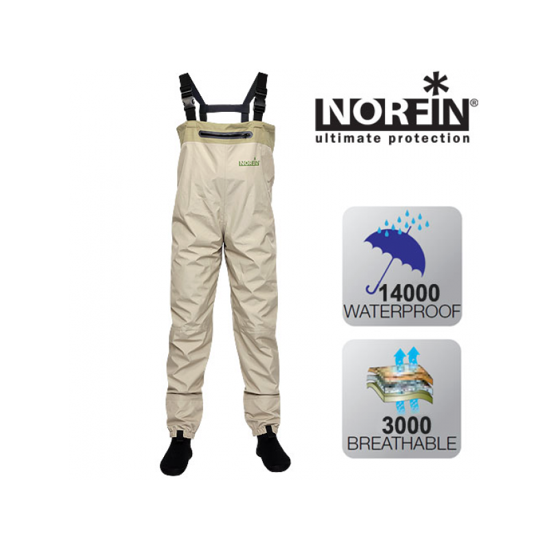 Kahlamispüksid NORFIN WHITEWATER on valmistatud kolmekihilisest “hingavast” membraankangast ning varustatud neopreensokkidega. Õige riietusega kahlamispükste all (hingavad materjalid, termopesu, fliisjope) kogutakse kehaniiskus membraankanga sisemise osa peale ning seejärel juhitakse välja.