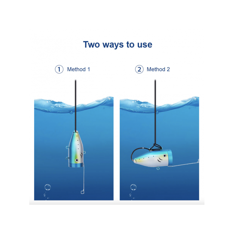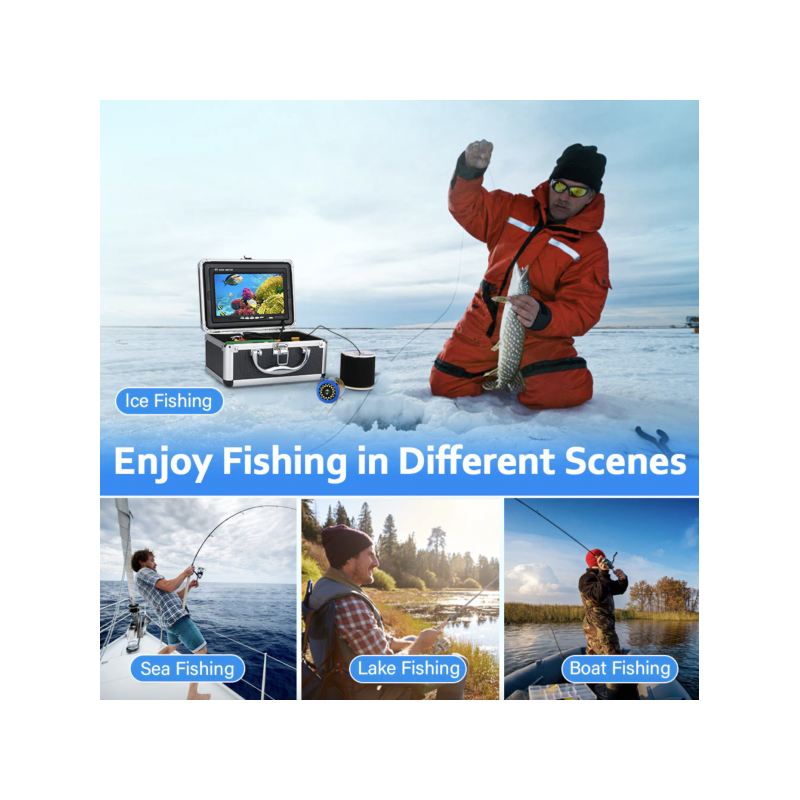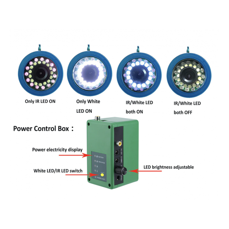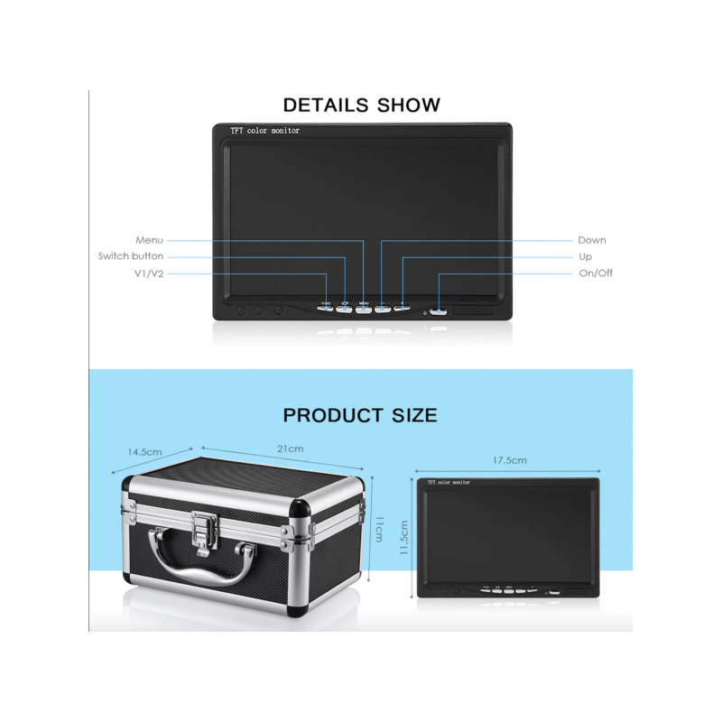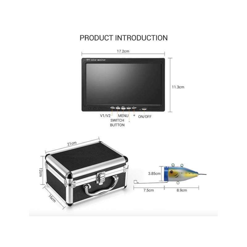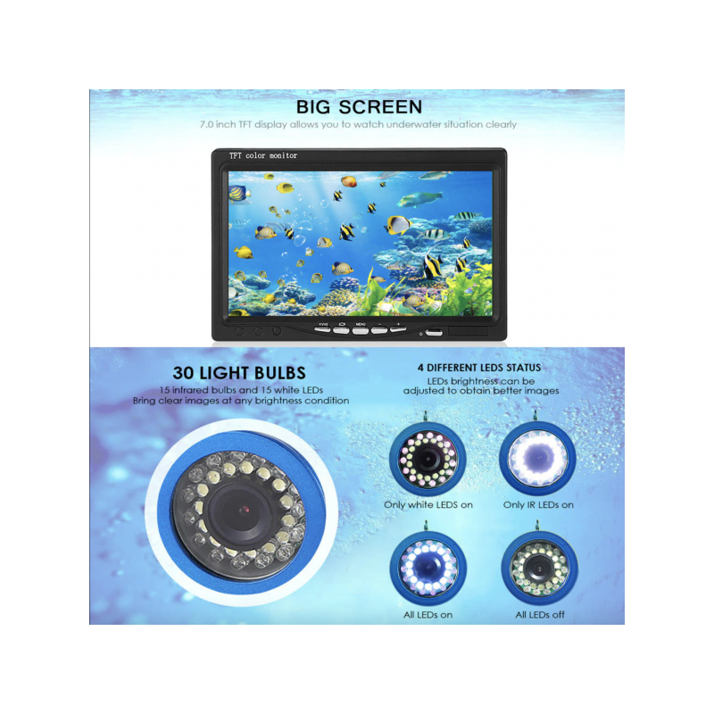 7-tolline TFT värvimonitor koos päikesesirmiga ereda väliskeskkonna jaoks, mugavam vaadata pilti päikesepaistelise ilmaga. Kaamera on alumiiniumsulamist veekindel kala kujutisena. Külma-, vee- ja tõmbekindlad kaablid. 15 tk valgeid LED-e, 15 tk infrapuna lampe, kõrge intensiivsusega. Kaamera juhe on 30 meetrit, et ei jääks ükski sügavus vaatamata. Aku pidev kasutusaeg on kuni 8 tundi ja aku oleku indikaator. 4 erinevat LED-olekut: valge LED põleb, IR LED põleb, kõik LED põleb, kõik LED on välja lülitatud, samuti saab reguleerida LED-i heledust parema kvaliteediga pildi saamiseks